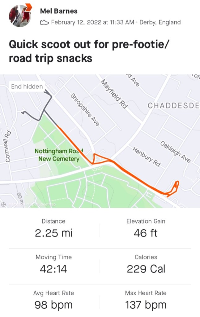 A long car ride to Leeds and back for the football so I got out early for a walk to Aldi to grab some healthy snacks for the car and to make lunch (pasta and salad) so I didn’t succumb to chips and hot chocolate.